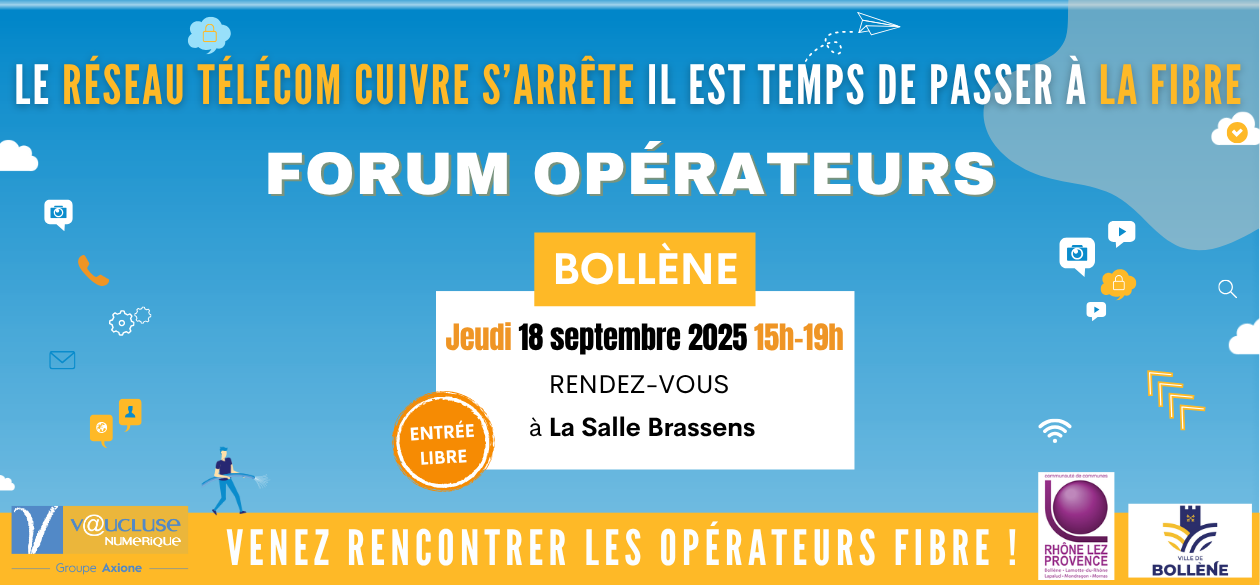 Si vous êtes encore connecté à ce réseau, vous pouvez anticiper la transition vers la fibre et ainsi éviter toute coupure de service en 2027. Pour vous accompagner dans ce choix, un Forum des Opérateurs se tiendra le 18 septembre à Bollène.