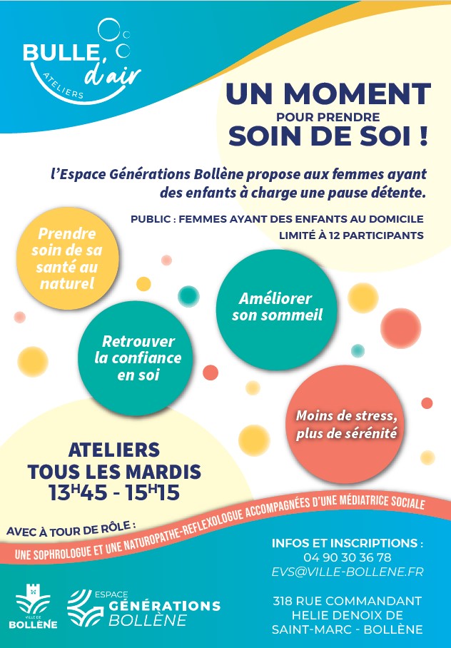 Tous les mardis de 13h55 à 15h15 avec une sophrologue ou une naturopathe-réflexologue accompagnée d'une médiatrice sociale. Sur inscription.