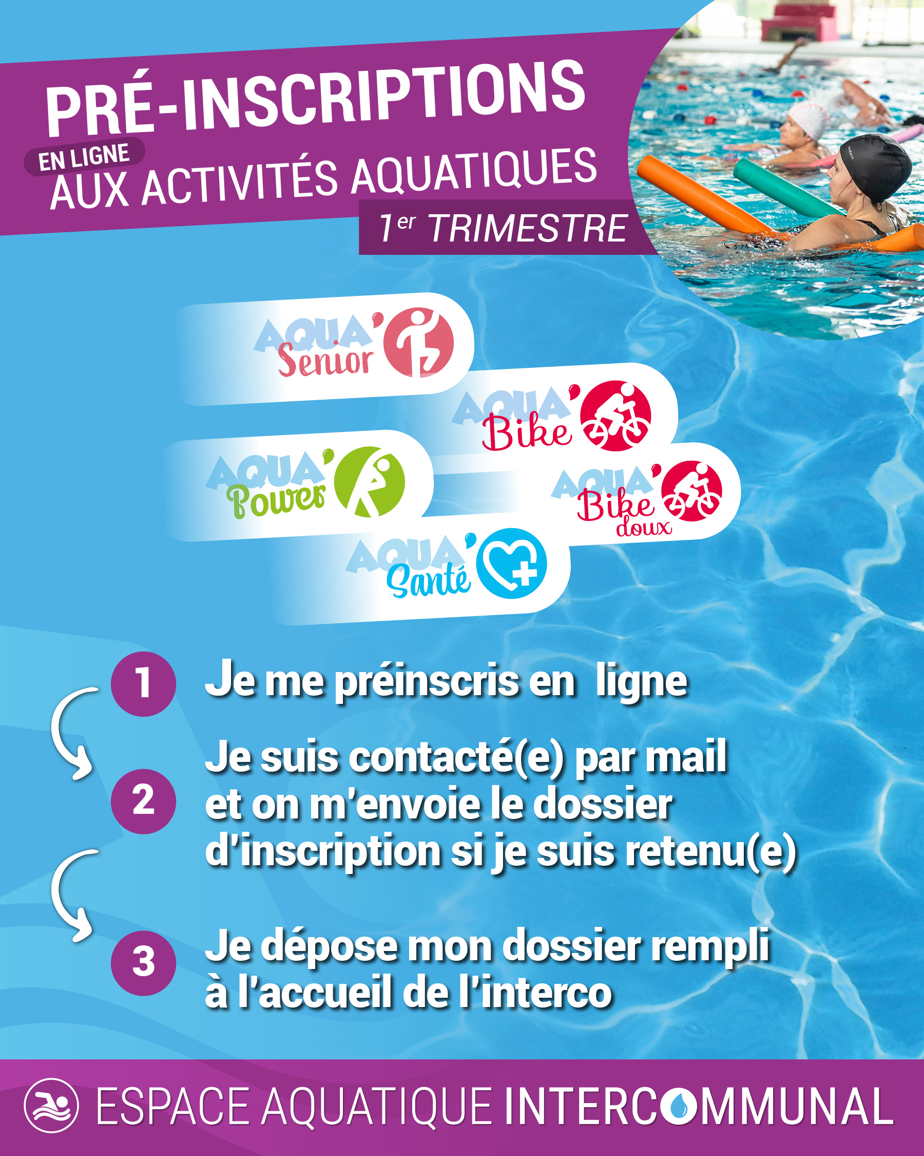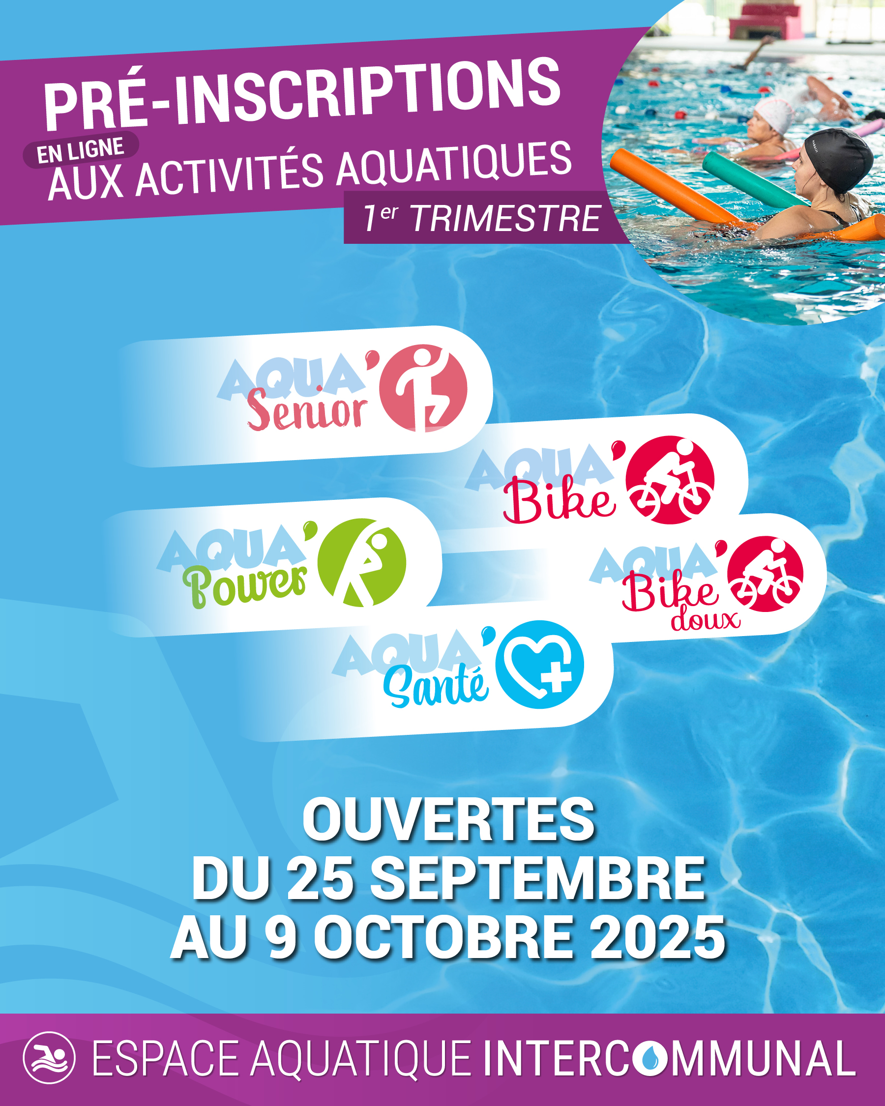 Les pré-inscriptions pour vos activités aquatiques préférées (AQUA BIKE, AQUA POWER, AQUA SENIOR, AQUA SANTE & AQUA BIKE DOUX) sont ouvertes et possibles :