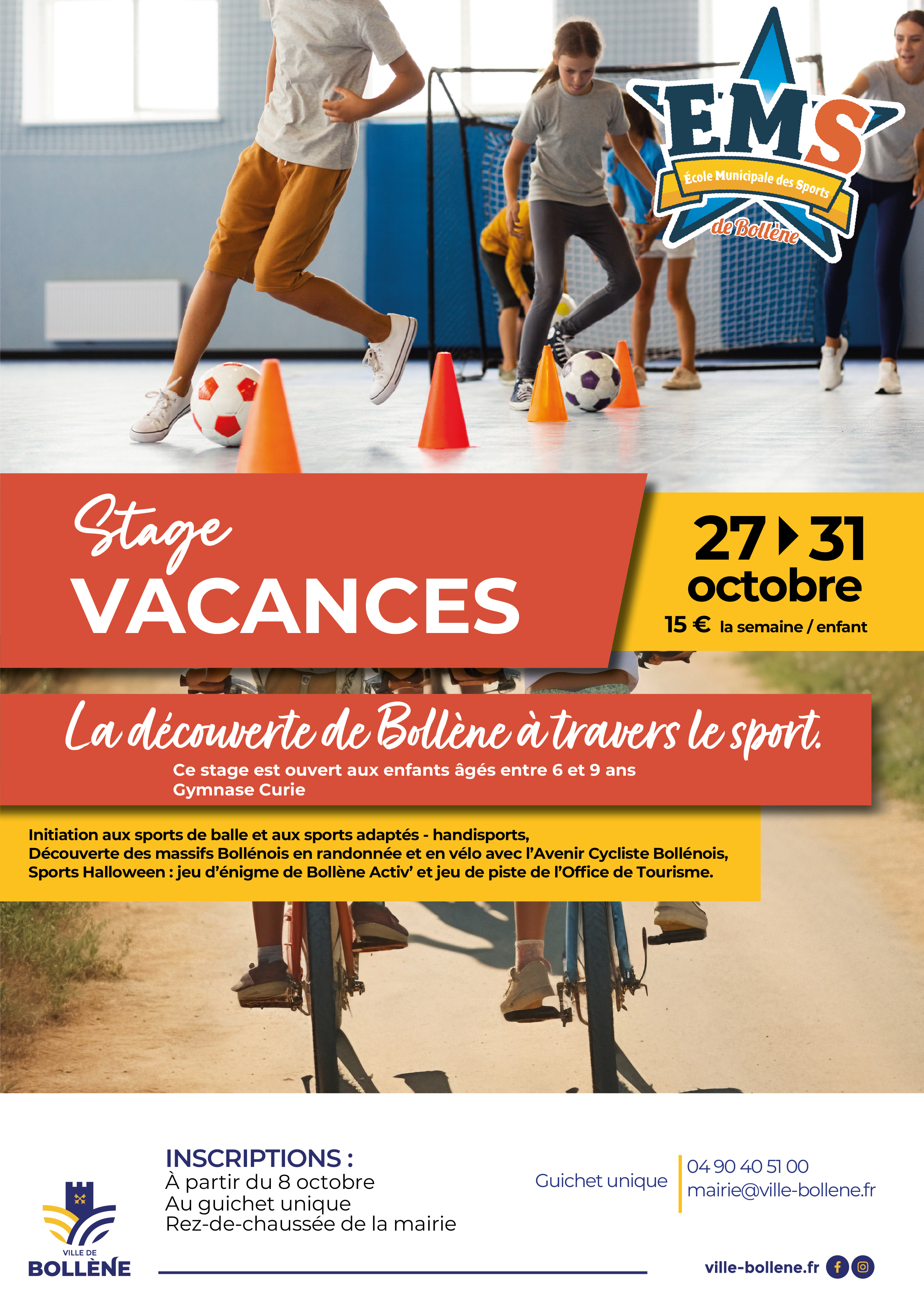 L’Ecole Municipale des Sports propose aux enfants un stage sportif du 27 au 31 octobre au gymnase Curie sur la thématique : la découverte de Bollène à travers le sport.